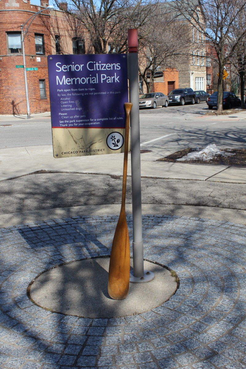 I’ve yet to have the oar in the water. I don’t have a boat, for one thing. But after hearing the “Two Girls and a Boat” story I’d like to think this oar had its share of adventures on several bodies of water. So now I’m taking snaps of it in various places on land, beginning with Senior Citizens Memorial Park in Bucktown.