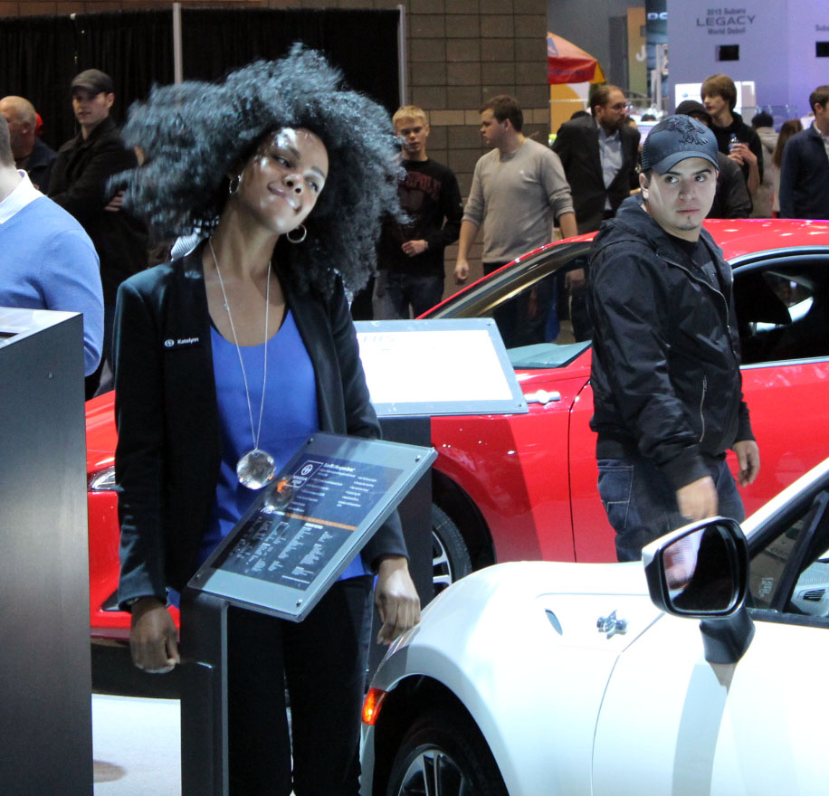 And so began Aidan’s visit to the Chicago Auto Show. Aidan’s camera focused mainly on the fashion of the show. Unlike many visitors, especially males, Aidan doesn’t get a hard on for engine blocks. So in a timely nod to New York’s Fashion Week. Let’s get started. And remember, Aidan thinks “couture” is a disease you get in France.